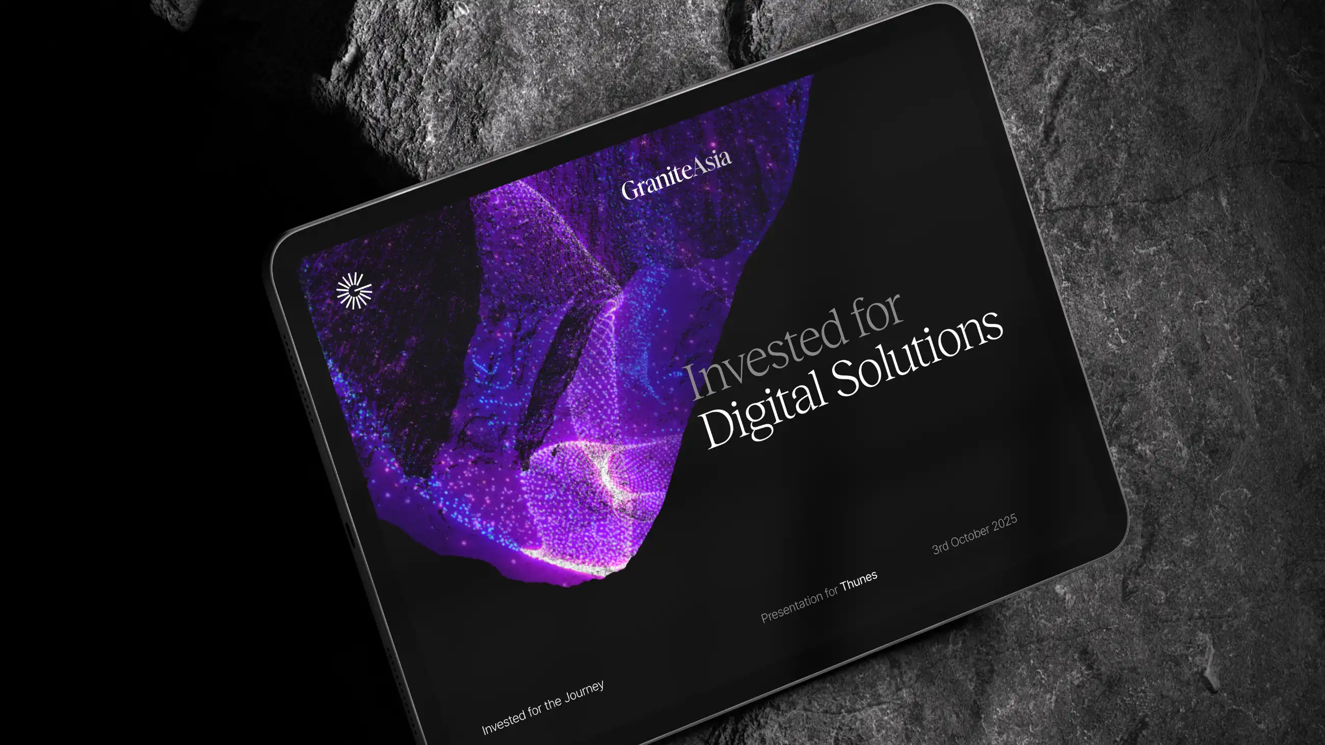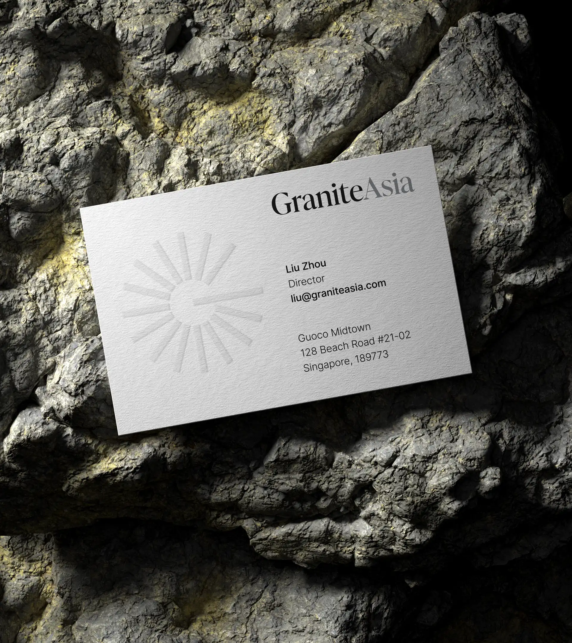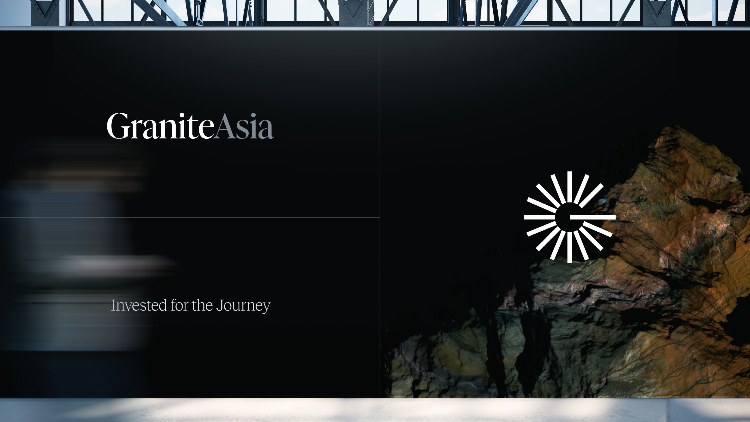 The brand leads with powerful imagery and media depicting Granite Asia’s core offerings and approach projected onto raw, untempered granite rocks.